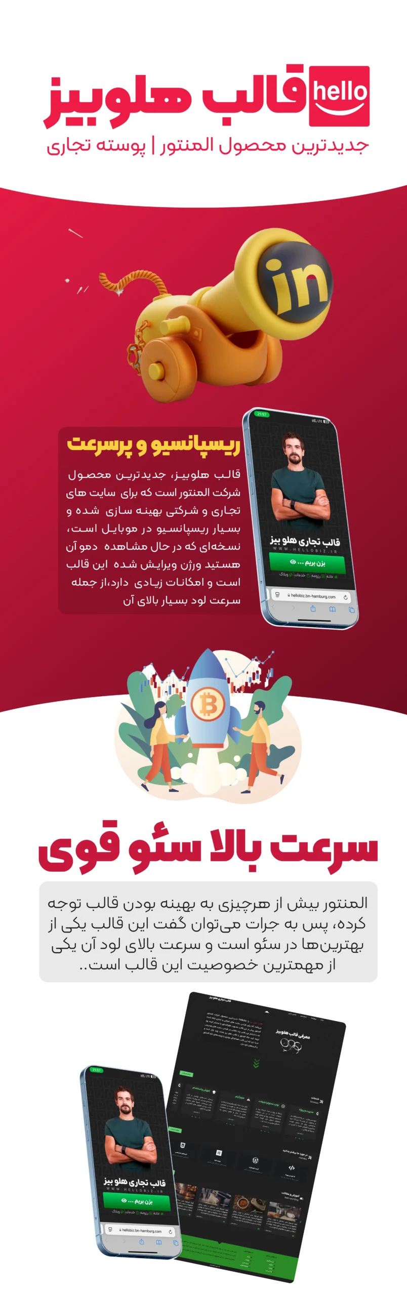 قالب هلو بیز یا Hellobiz جدیدترین محصول شرکت المنتور میباشد که برای طراحی سایت های شرکتی و تجاری ارائه شده، المنتور پیش از این قالب محبوب هلوالمنتور را منتشر کرده بود که با انتشار این قالب یک انقلاب در طراحی سایت های وردپرس ایجاد کرد، حالا المنتور با قالب هلو بیز مجدد وارد بازار شده و ادعا دارد که این قالب هماهنگی بهتری با ویجتهای تازه المنتور و کیتهای تازه دارد.